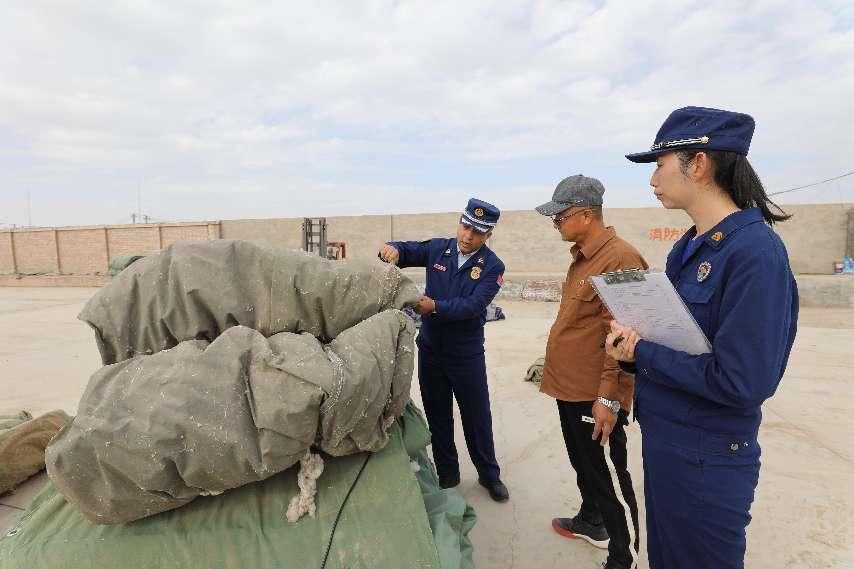 图为阿克苏地区消防救援支队消防监督员检查涉棉企业使用的篷布是否属于阻燃材料。(汪渝 摄)