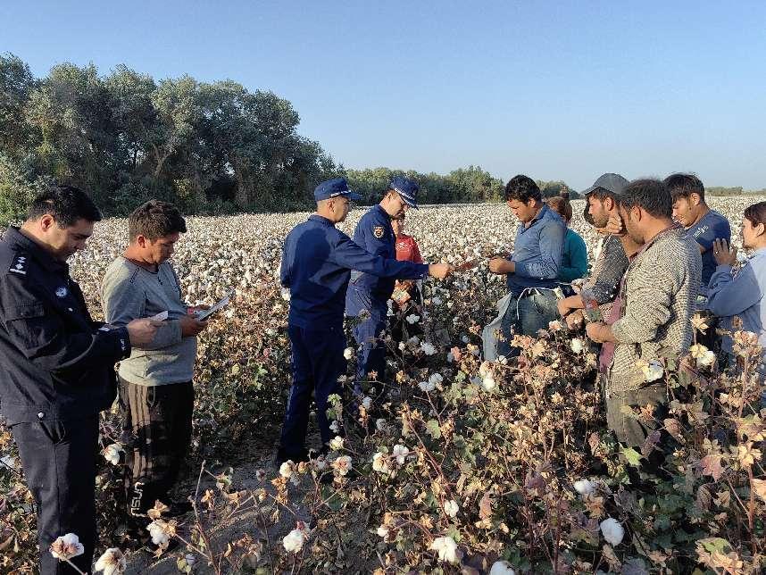 图为:喀什地区消防救援支队消防宣传人员向棉农发放了宣传单,宣传和普及消防法律和法规、火灾预防等知识(祖丽皮娅木·吐尔荪 摄)