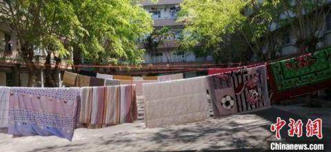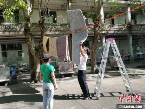 中新网海口5月4日电 (记者 张茜翼)海南省高校学生将于5月9日至20日分批错峰返校。海南各大高校教职工“花式”发动,使用返校前的大晴天,为学生暖心晒被、打扫卫生,做好消杀等准备作业。