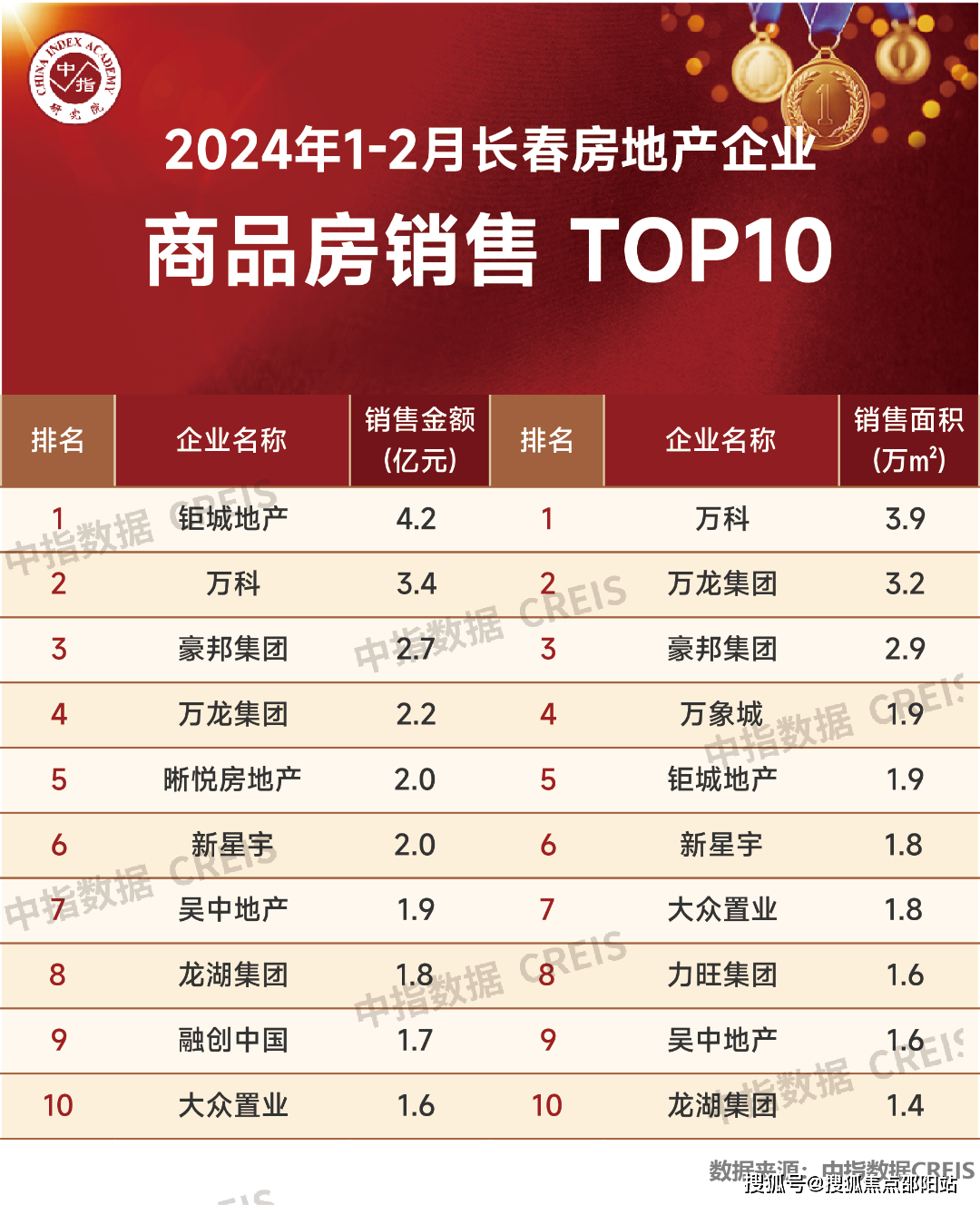 特别声明:房地产企业销售数据统计是以2024年1-2月期间销售的商品房与商品房为统计口径,项目销售数据以商品房为统计口径,主要是根据中指数据CREIS(点这里就可以看)在长春的销售监测数据。本榜单仅供参考,不保证数据的准确性、完整性及可靠性,不对使用榜单及内容所引发的任何直接或间接损失承担责任。